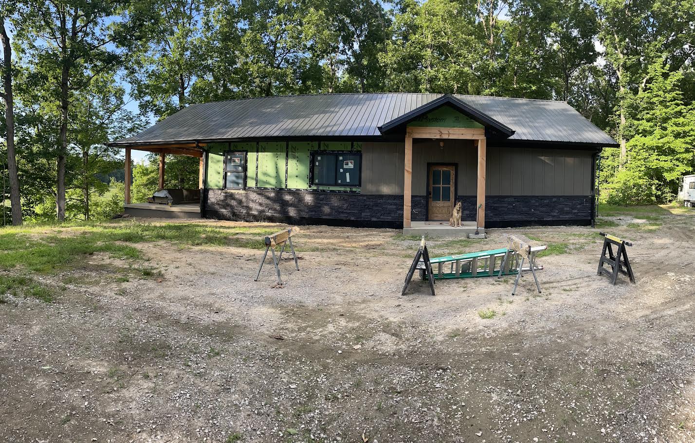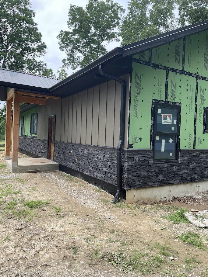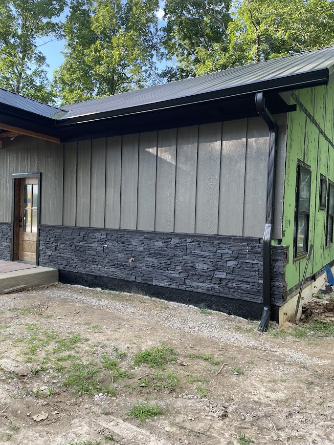 Daniel Carroll enhanced his home’s exterior with bold iron ore stone wainscoting using GenStone’s Iron Ore panels. Wrapped around the lower portion of the home, the dark faux stone creates a strong contrast against the light vertical siding and metal roof, grounding the structure and giving it a clean, finished appearance. The deep charcoal tones of Iron Ore pair especially well with modern farmhouse and cabin-style builds, adding visual weight without overpowering the design.